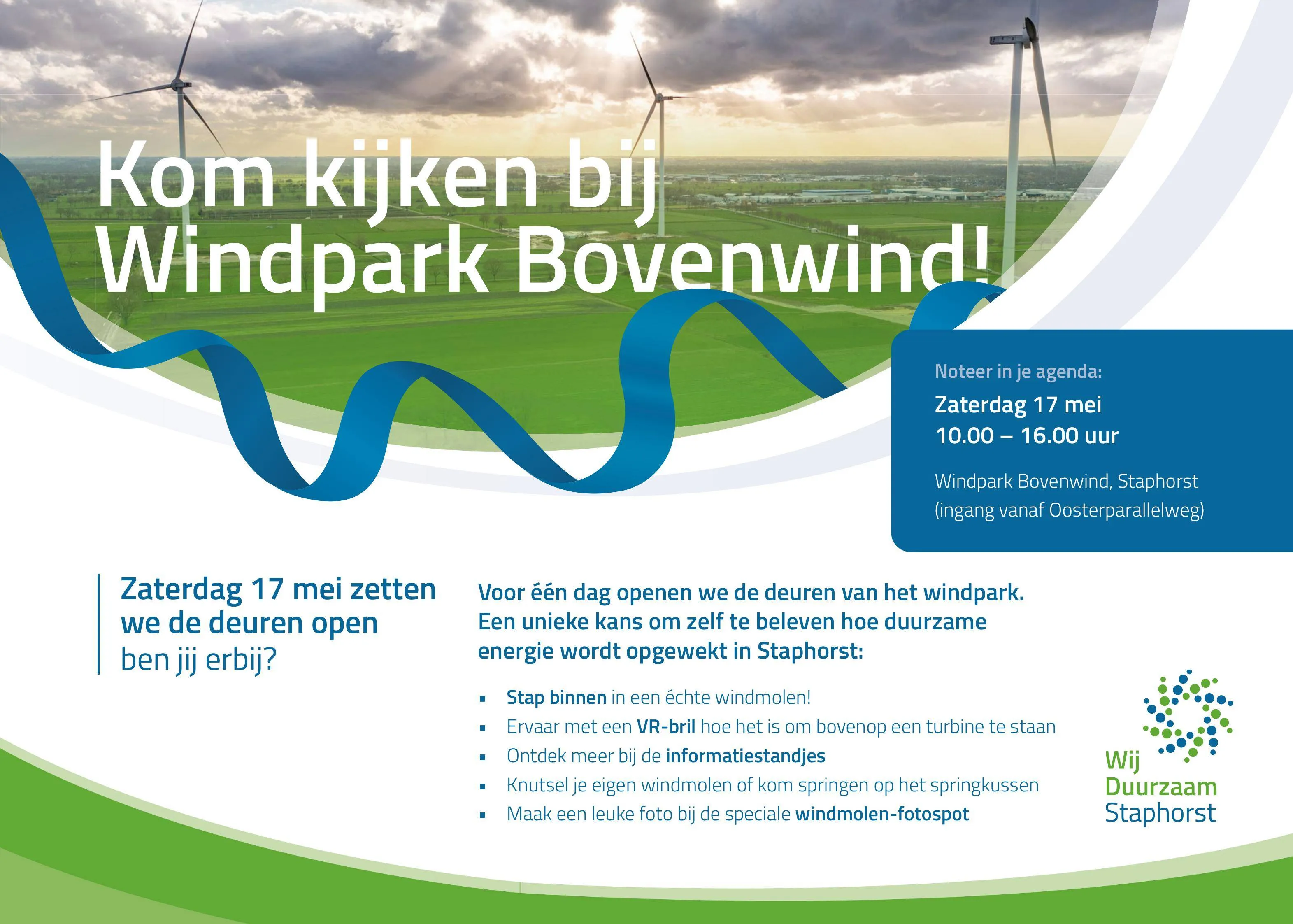 Geïnteresseerden kregen de unieke kans om van dichtbij te ervaren hoe duurzame energie wordt opgewekt in de gemeente Staphorst. Bezoekers konden onder andere met een VR-bril ervaren hoe het is om bovenop een turbine te staan. Daarnaast waren er informatiestands waar men meer te weten kon komen over windenergie en het project Bovenwind.
