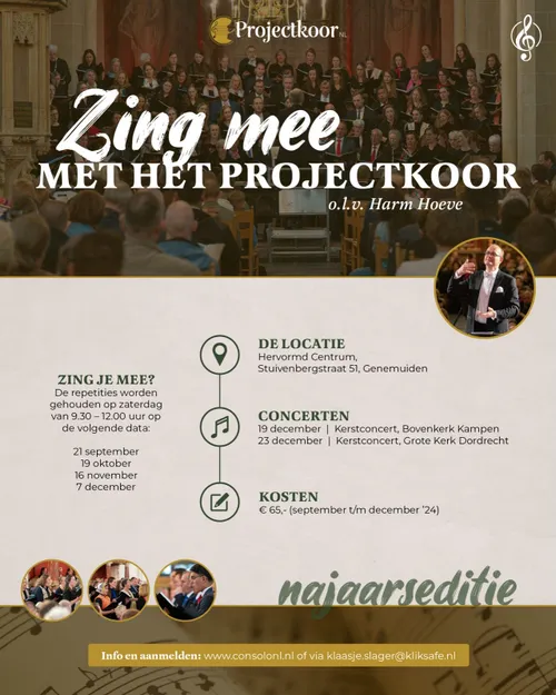 Zou je (weer) in een projectkoor willen zingen, maar vind je een wekelijkse koorrepetitie te veel? Dan is dit een unieke kans. ProjectkoorNL geeft twee kerstconcerten. Wil je ook meedoen? Geef je dan op via www.consolonl.nl of via [email protected]. Je kan je opgeven tot en met 20 september 2024