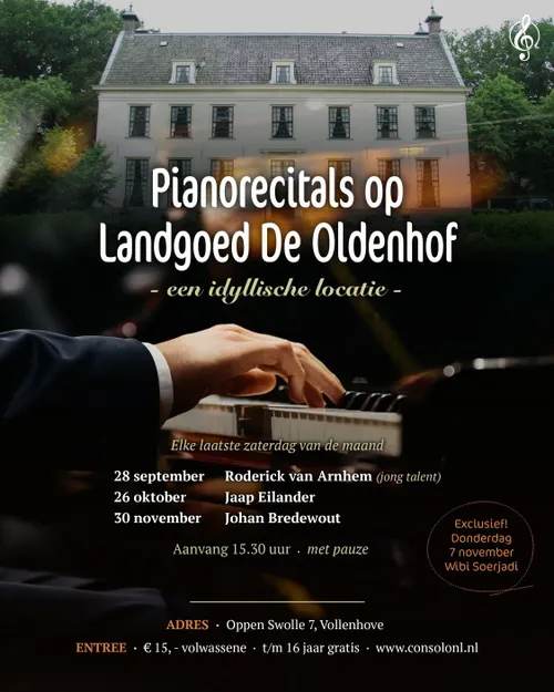 Dit najaar worden er op Landgoed De Oldenhof in Vollenhove vier pianorecitals gehouden. Concervatoriumstudent Roderick van Arnhem start de vierdelige reeks op 28 september 2024. Jaap Eilander volgt op 26 oktober 2024. De alom bekende pianist Wibi Soerjari verzorgt een pianorecital op donderdag 7 november 2024. Johan Bredewout uit Vollenhove houdt het slotconcert op het landgoed op 30 november 2024. Alle concerten beginnen om 15.30 uur, een pauze inbegrepen. Kinderen tot 16 jaar kunnen kosteloos naar binnen. Voor aanvullende informatie en tickets: consolonl.nl