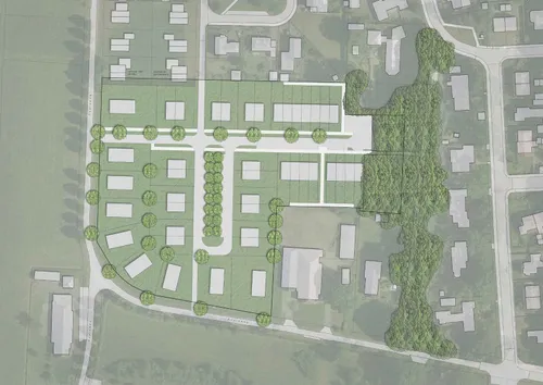 Er zijn twee bebouwingsvarianten getekend door het bureau B+O, bovenstaand optie A met centraal twee-onder-een-kappers en meer huizen in de buitenbocht, onderstaand optie B met centraal ook vrijstaande huizen en een ruimere indeling van de buitenbocht. Wie geïnteresseerd is om op een van deze kavels te wonen kan dit aangeven via het