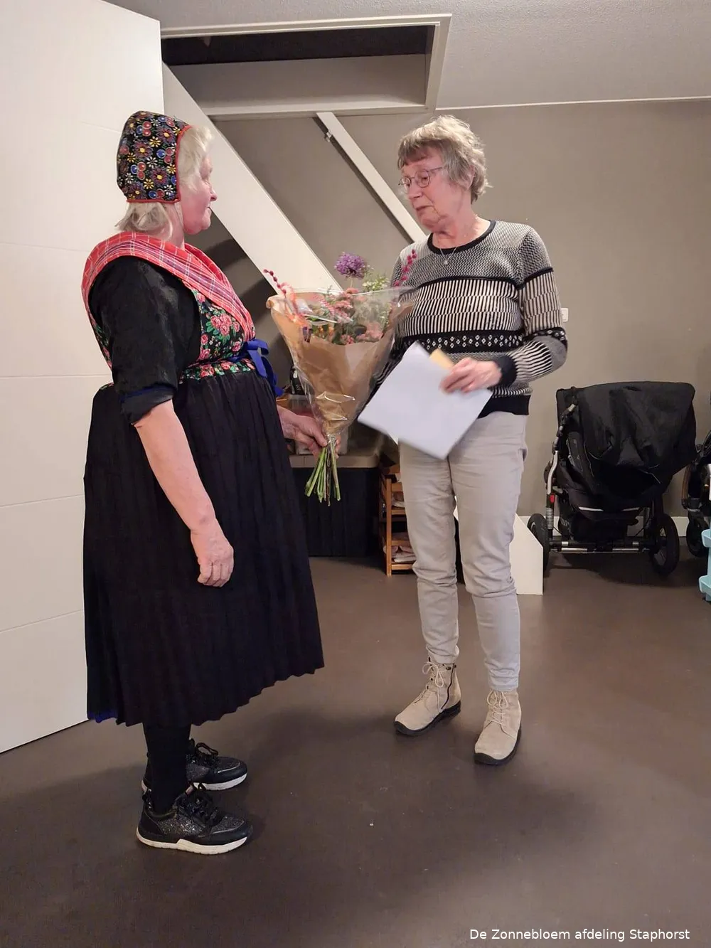 Op de foto van links naar rechts. Geertje de Weert, 3 jaar secretaresse. Zij stopte er nu mee en ontving een boeket bloemen. Elly Scholing, ruim 25 jaar contact/bezoekdame en bestuurslid activiteiten. Zij en Geesje Roze, 25 jaar vrijwilliger, mochten een bronzen beeldje in ontvangst nemen, Hanneke Schuurman vrijwilliger, maar zij stopt hiermee, zij ontving ook een boeket bloemen. Alle dames blijven betrokken (actief als vrijwilliger of als deelnemer) bij de Zonnebloem afdeling Staphorst.