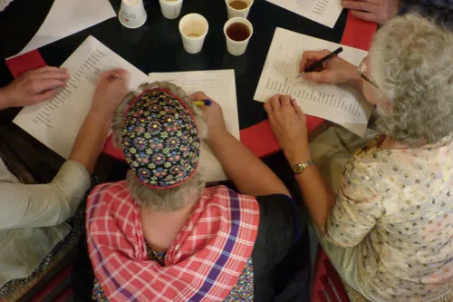 Na al deze verhalen werden er 25 dialectwoorden uitgedeeld die niet vaak meer gebruikt worden. Het kost tijd en veel gesprekken aan de tafels om de ware betekenis te ontdekken. In het laatste deel van de avond werden er dia’s getoond met details die onderweg in de dorpen te vinden zijn. Maar toch kijkt men blijkbaar niet altijd goed of hebben alleen het complete plaatje op het netvlies. De dia’s die daarop volgden, vaak met jonge dorpsbewoners uit de tweede helft van de vorige eeuw, riepen regelmatig herkenning op. Het was een gezellige avond met veel reuring, zeker toen Grietje Brakke vertelde dat dit de laatste dialectavond was.... maar toen ze daaraan toevoegde dat het voortaan in de dialectmaand maart gaat plaatsvinden, volgde applaus.