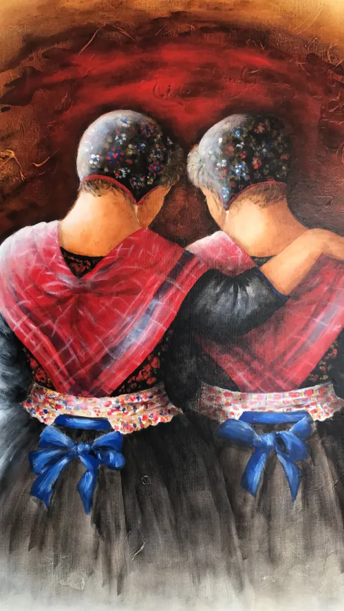 Als huwelijkscadeau, bijna veertien jaar geleden, mochten wij een schilderij uitzoeken. Een schilderij voor onze nieuwe woonkamer. We hebben toen een schilderij van Betty Jansma uitgekozen: twee vrouwen in Staphorster klederdracht waarbij de één een arm om de ander heenslaat. Ze lijken geborgenheid of troost bij elkaar te zoeken. Ze zijn er voor elkaar. ‘Zusterliefde’ zei iemand onlangs nog. Het is trouwens mooi om te zien wanneer we bezoek krijgen. De visite blijft vaak even voor het schilderij staan. Meestal is dat een start voor een mooi gesprek over de zorg en omgang met elkaar.