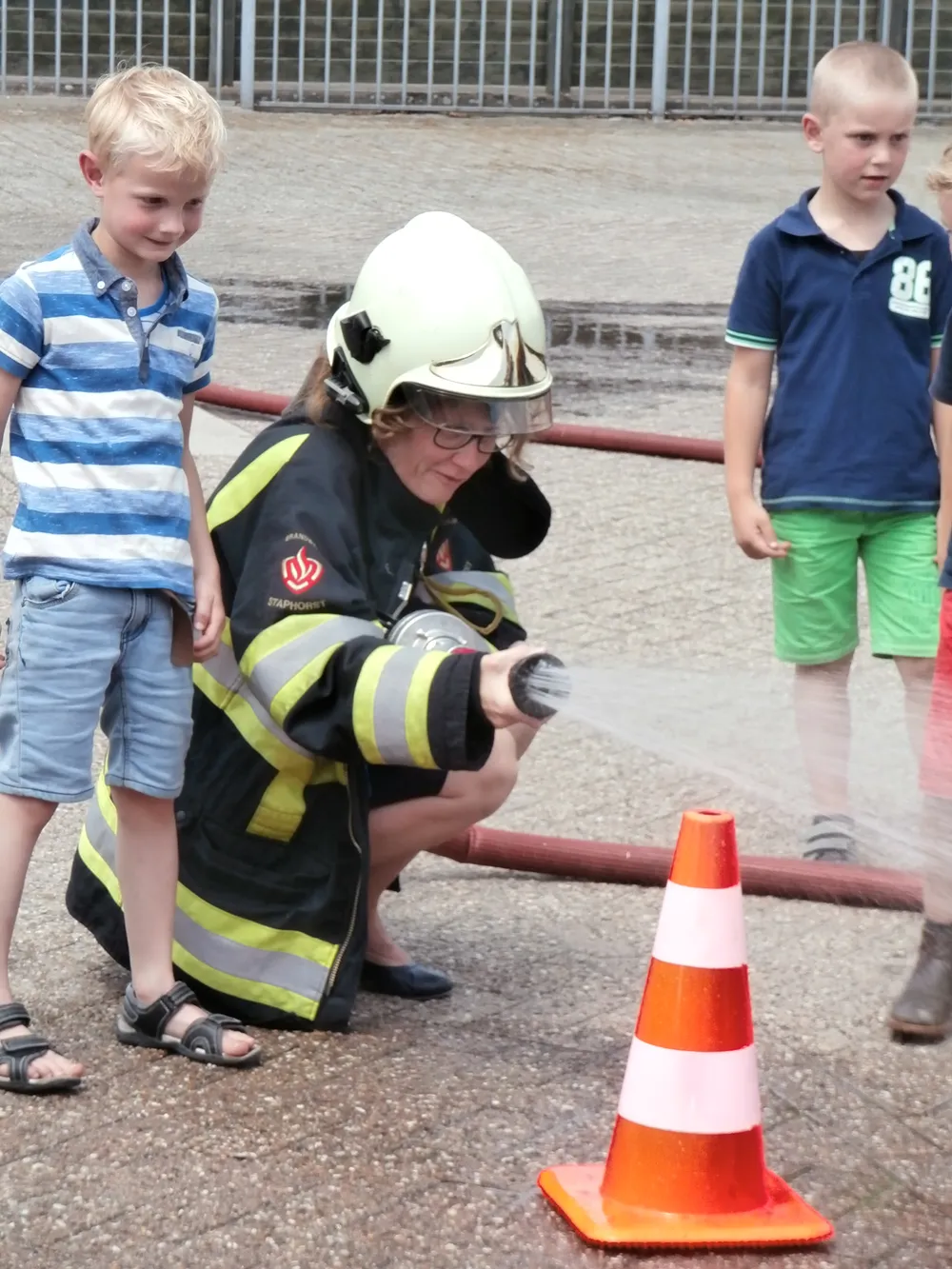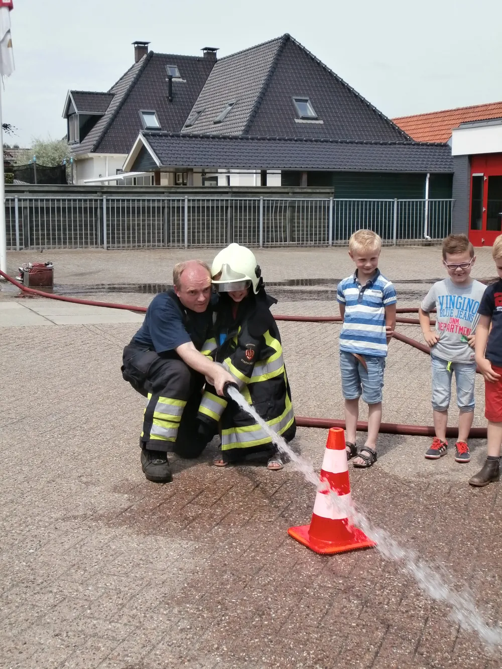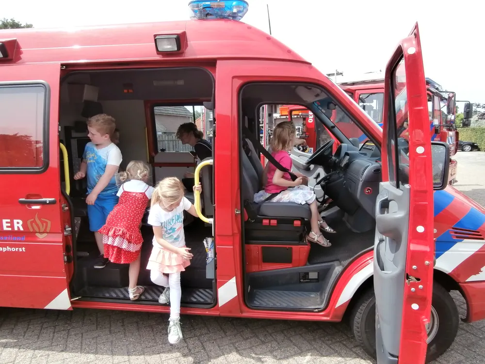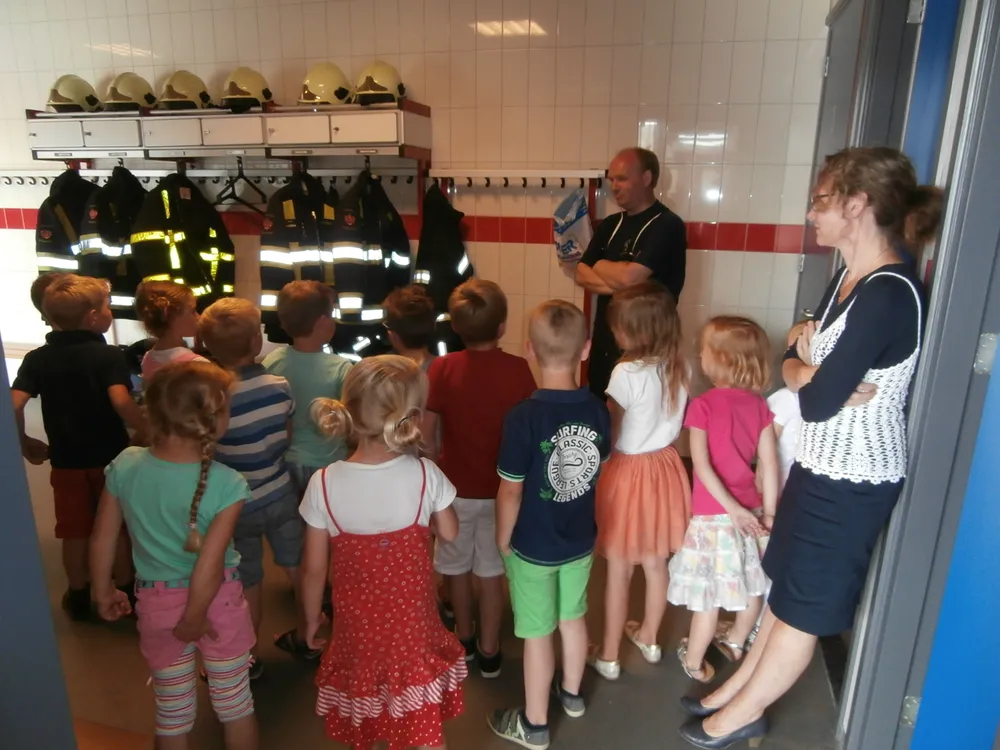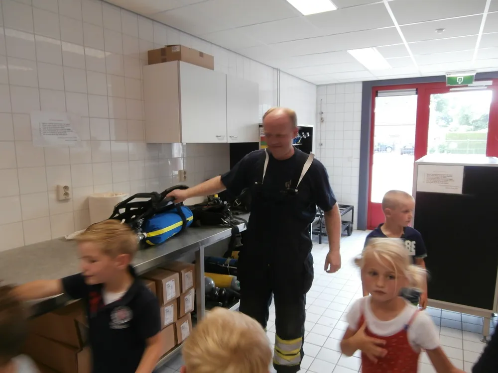 Brandweerman Erik Mussche gaf samen met een collega onderwijs aan de kleuters over het werk van de brandweer. Er werd ook geoefend in het hanteren van de brandspuit. De kazerne en de brandweerauto werden vervolgens van binnen bekeken.