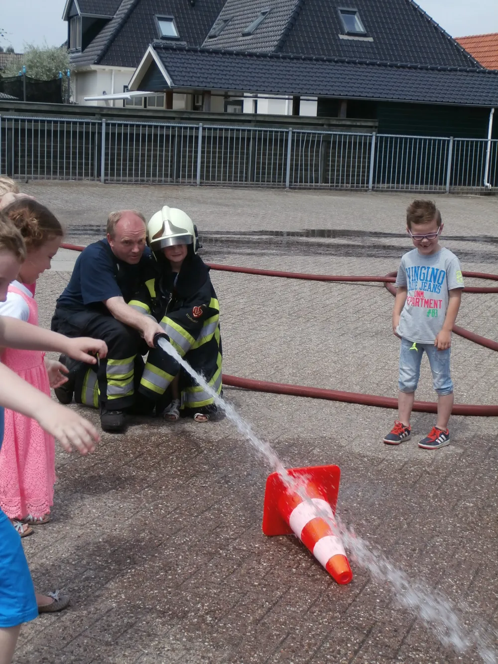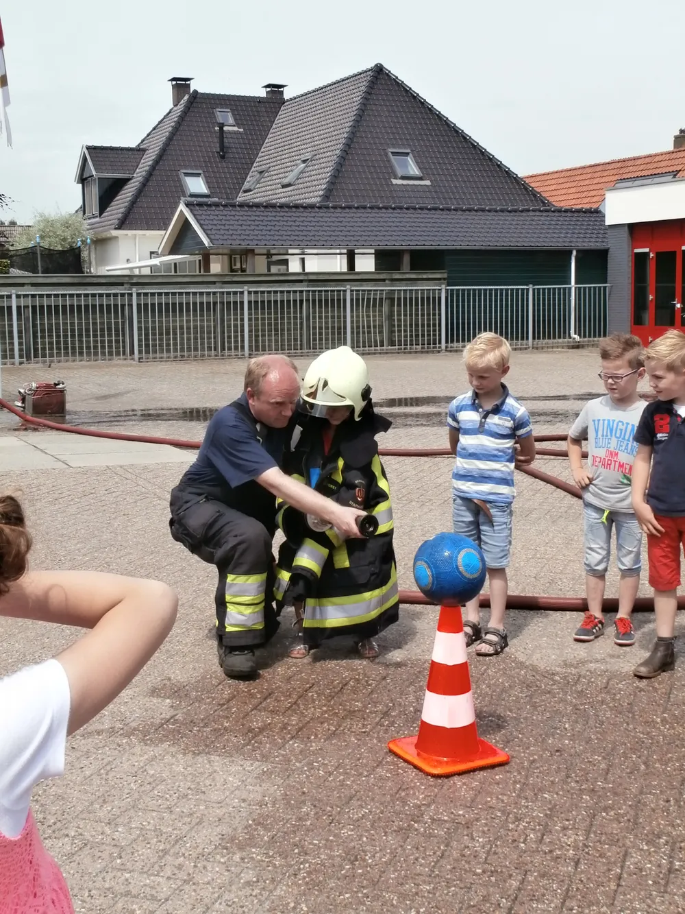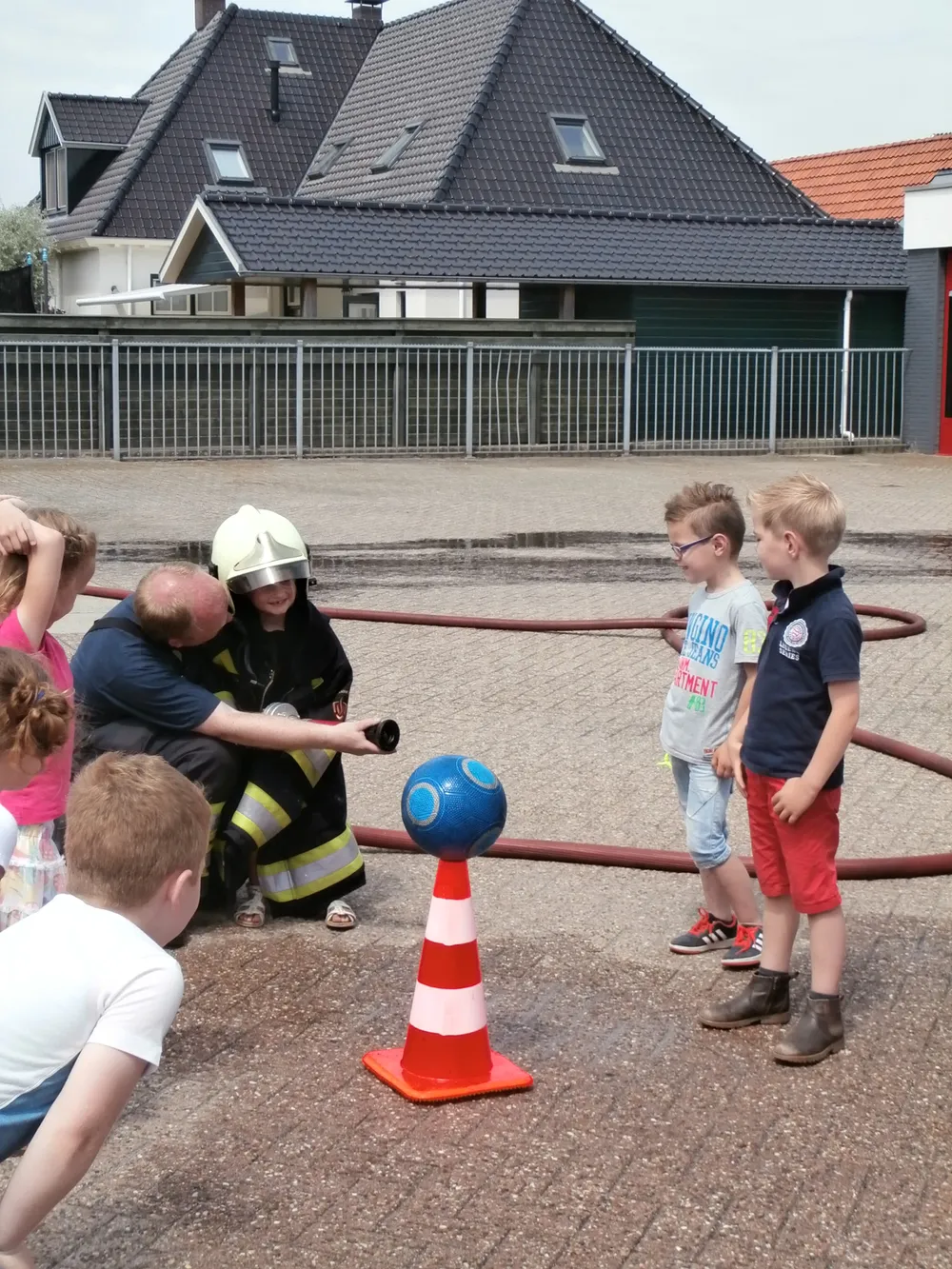 Brandweerman Erik Mussche gaf samen met een collega onderwijs aan de kleuters over het werk van de brandweer. Er werd ook geoefend in het hanteren van de brandspuit. De kazerne en de brandweerauto werden vervolgens van binnen bekeken.