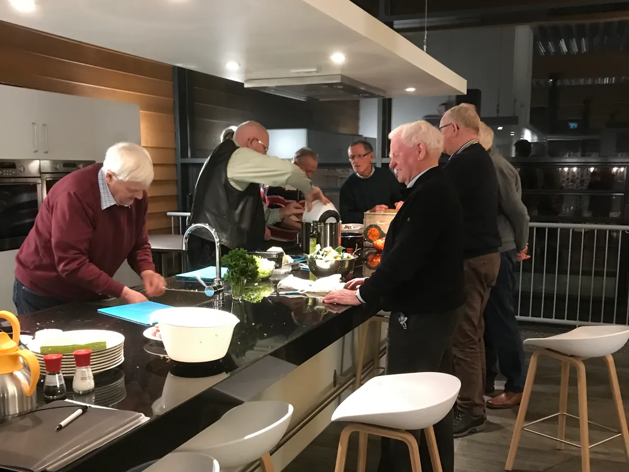 Het is een gemengd gezelschap, de jongste is 19 en de oudste 82. Ze hebben allemaal zo hun eigen reden om deel te nemen aan deze speciale kookcursus voor mannen. De een doet het vooral voor de gezelligheid, de ander heeft nog nooit gekookt en wil het toch graag leren. Niet alle mannen kennen elkaar maar de sfeer zit er meteen goed in op deze eerste avond. Het enthousiasme is groot.