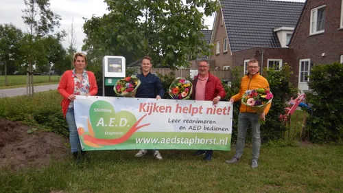 Bestuurslid Els Buitenhuis van AED Staphorst voorzag de initiatiefnemer, de helper en de gastheer van een mooie bos bloemen als dank voor de inspanningen. Vorige week is de nieuwe AED in Rouveen West in gebruik genomen tijdens een kleine lokale demonstratie met spandoek.