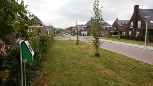 De AED-buitenkast hangt aan het begin van de Beukenlaan vanaf het Scholenland. Maarten Petter had al eerder gemeld: “Hij mag bij mij aan de muur”. Het tuinschuurtje bleek echter geen ideale plek. Daarom hangt hij aan een RVS-beugel aan de erfgrens. De benodigde stroomkabel loopt door mantelbuis in de grond.