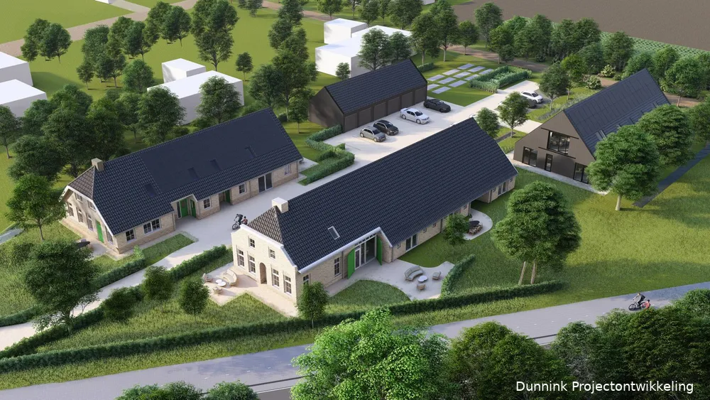 Aan de oostkant komt een nieuwe dubbele woonboerderij met een stukje daarachter een schuur met daarin zes garageboxen onder één dak, met een eigen oprit/parkeerplaats. Aan de westkant wordt en blijft het (veel kortere) 'slag' een weiland. Een bomenrij daarop zal op een natuurlijke wijze bijdragen aan de privacy van de bewoners.